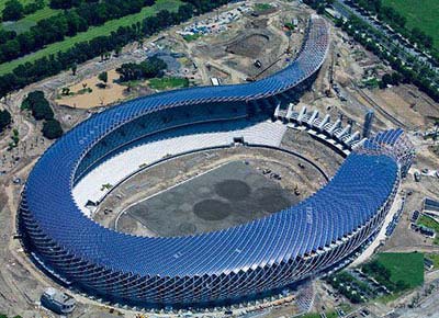 2、太陽能體育場龍騰體育館是目前臺灣最大的體育場,也是世界上第一座完全由太陽能供電的運(yùn)動場館。該體育館以龍為主題,場館屋頂上的8844塊太陽能電池板構(gòu)成了巨龍身上的鱗片。龍騰體育館總裝機(jī)容量為1兆瓦。
