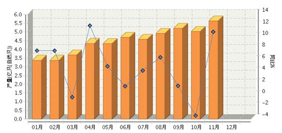 2015年1~11月,全國鋰離子電池行業累計完成產量同比增長-0.57%。其中:11月份完成產量同比增長-3.4%。2015年全國鋰離子電池行業月度產量及同比如上圖所示。